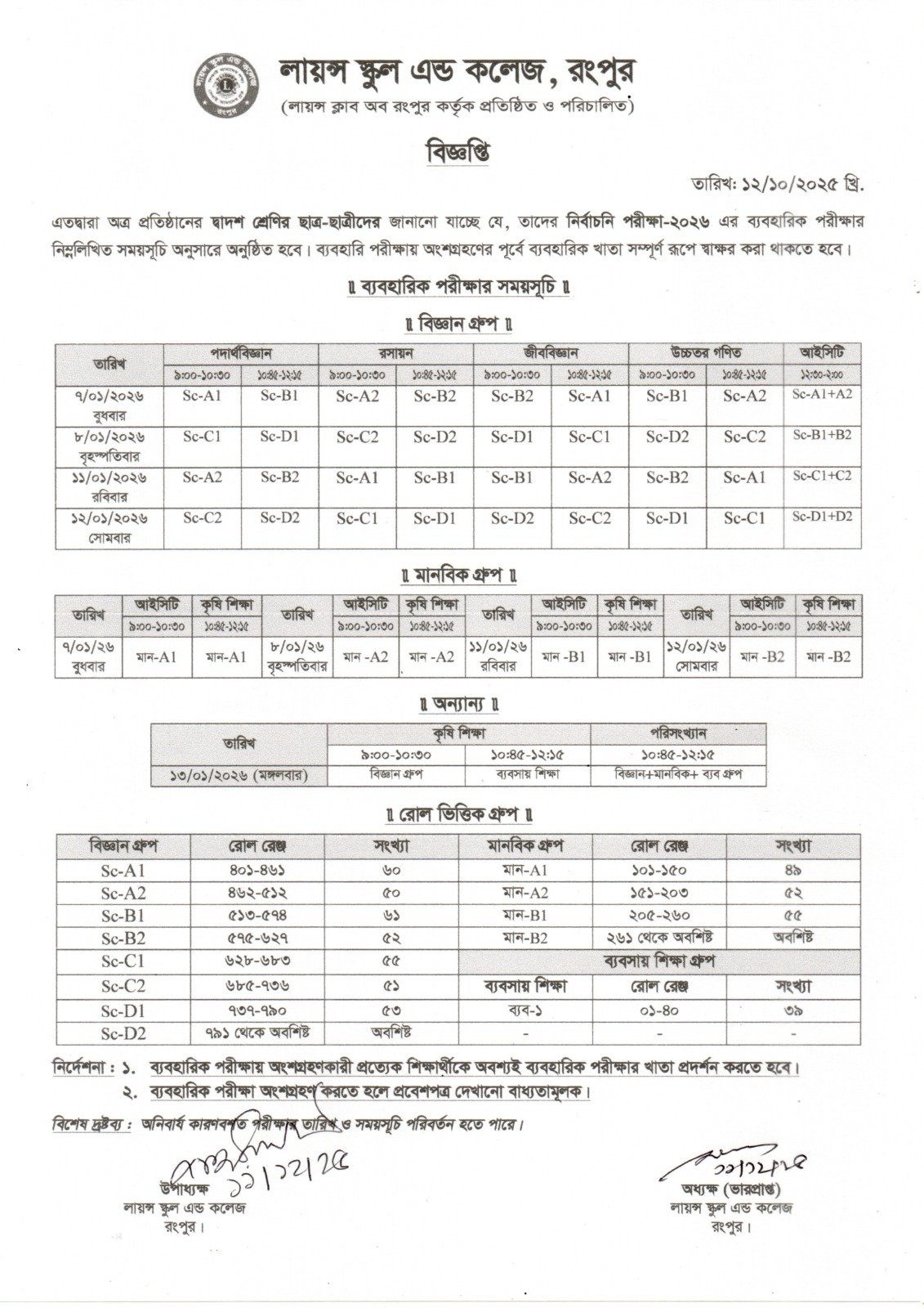 দ্বাদশ শ্রেণির নির্বাচনি পরীক্ষা-২০২৬ এর ব্যবহারিক পরীক্ষার সময়সূচি