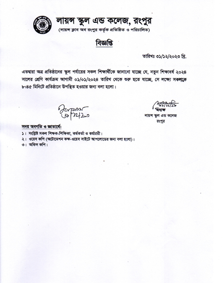 নতুন শিক্ষাবর্ষ ২০২৪ সালের শ্রেণি কার্যক্রম শুরুর নোটিশ
