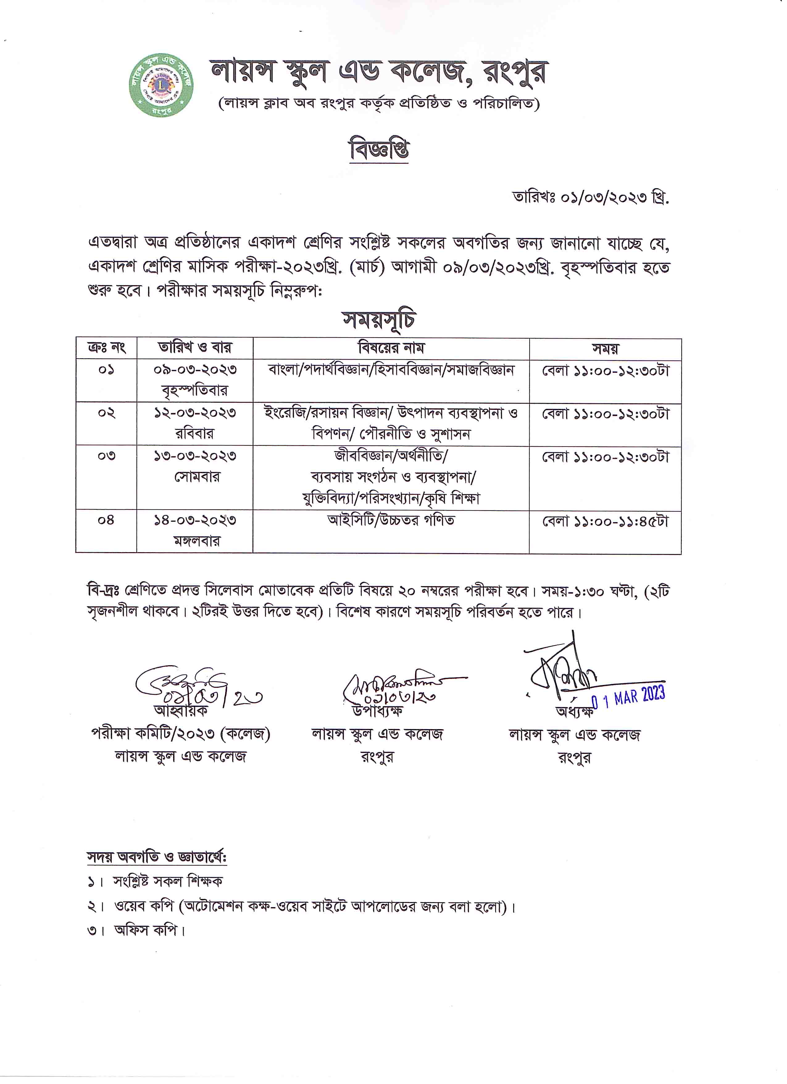 একাদশ শ্রেণির মিডটার্ম পরীক্ষার সময়সূচী