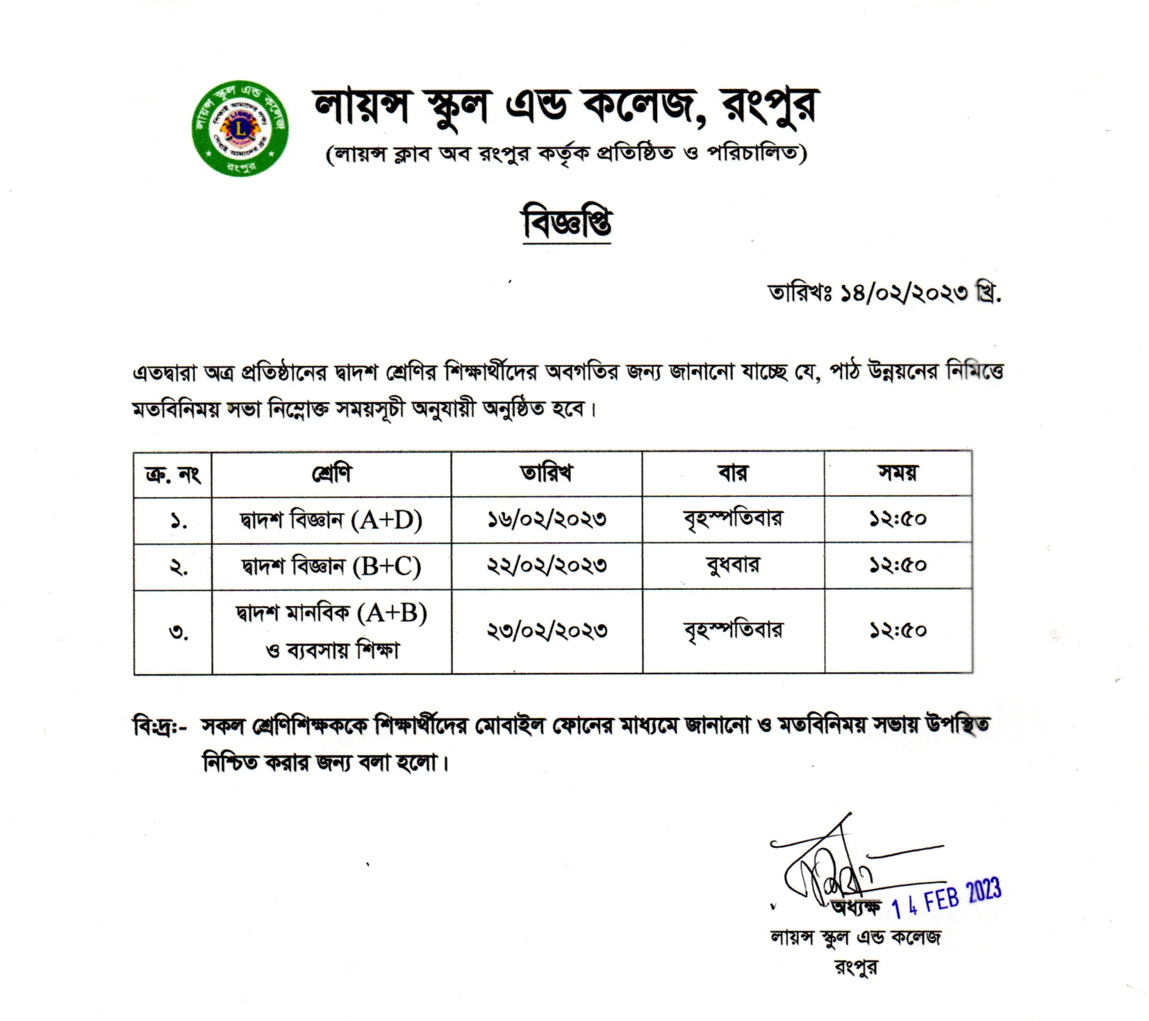 দ্বাদশ শ্রেণীর পাঠ উন্নয়নের নিমিত্তে মতবিনিময় সভার নোটিশ