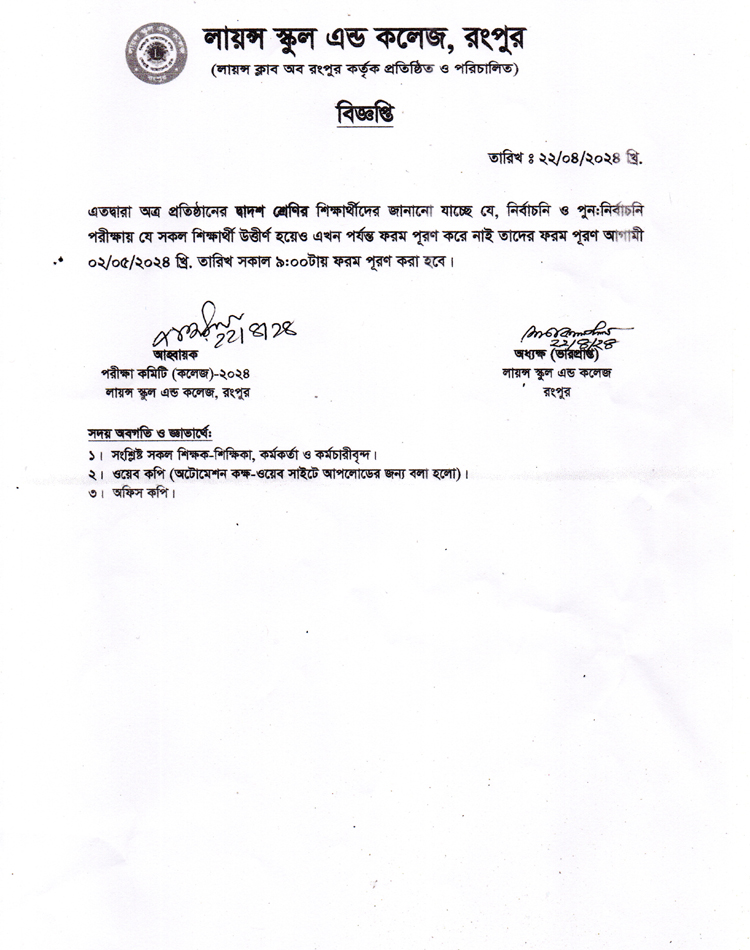 দ্বাদশ শ্রেণির ফরম পূরণ সংক্রান্ত নোটিশ