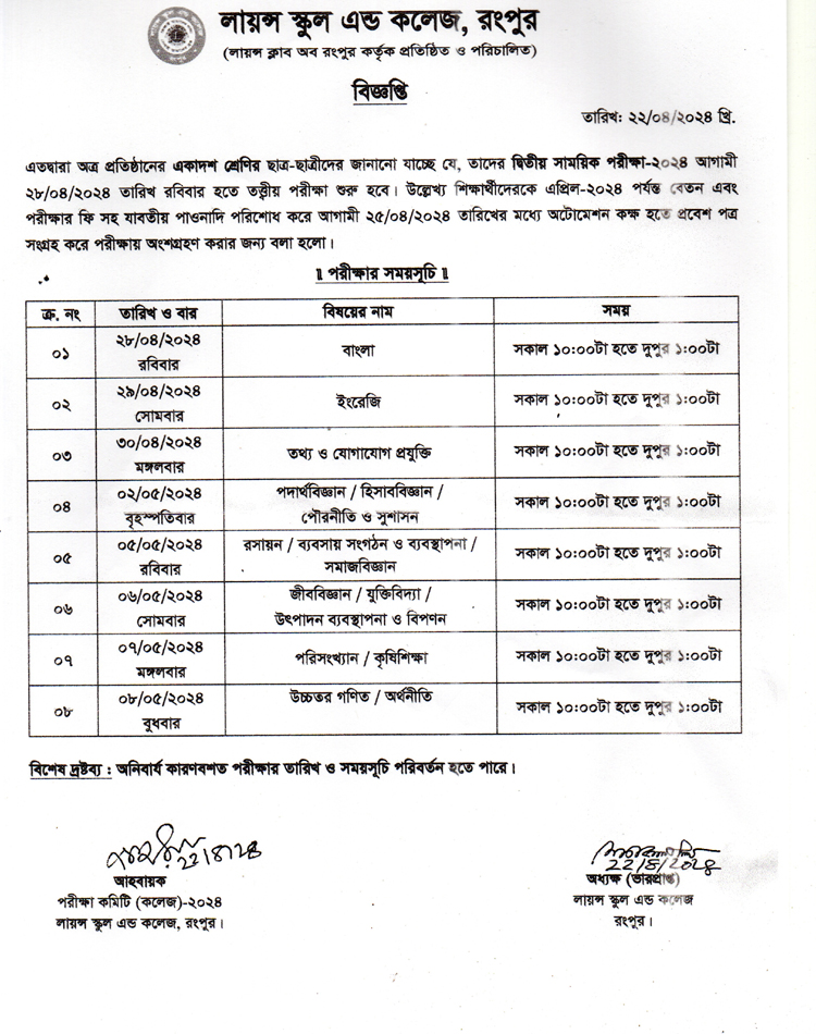 একাদশ শ্রেণির দ্বিতীয় সাময়িক পরীক্ষা-২০২৪