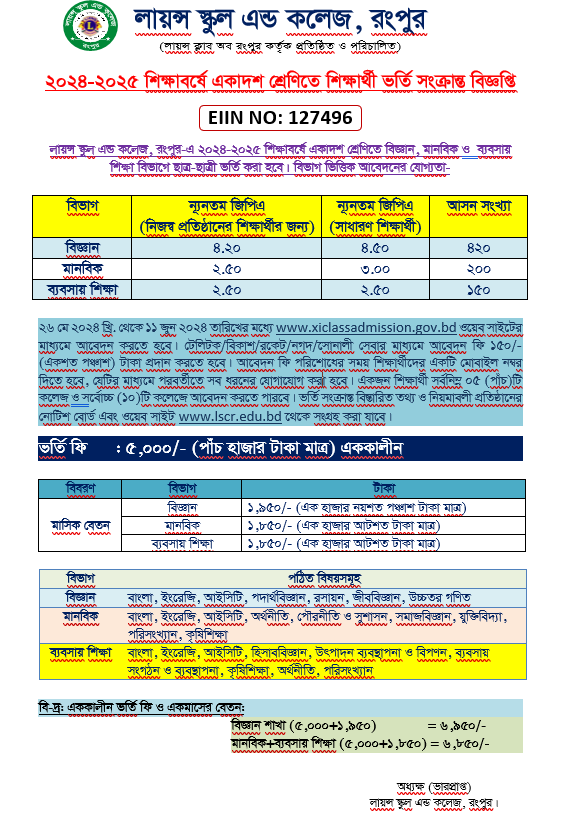 ২০২৪-২০২৫ শিক্ষাবর্ষে একাদশ শ্রেণিতে শিক্ষার্থী ভর্তি সংক্রান্ত বিজ্ঞপ্তি