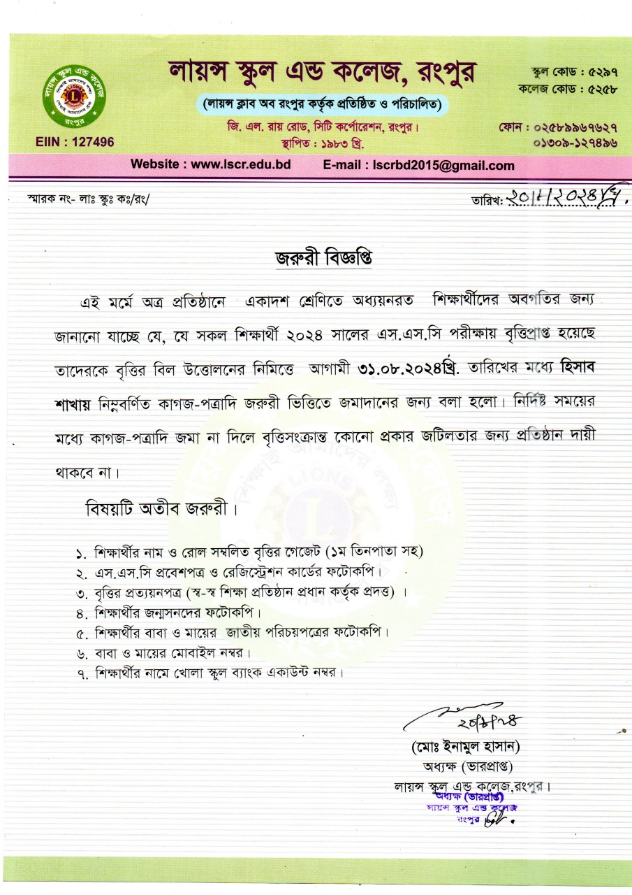 ২০২৪ সালের এস.এস.সি পরীক্ষায় বৃত্তিপ্রাপ্ত ছাত্র/ছাত্রীর কাগজ পত্রাদি জমাদান সংক্রান্ত নোটিশ