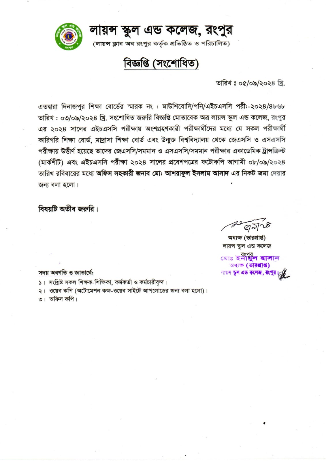 এইসএসসি পরীক্ষা-২০২৪ অংশগ্রহনকারী ছাত্র-ছত্রীদের জন্য বিশেষ নোটিশ