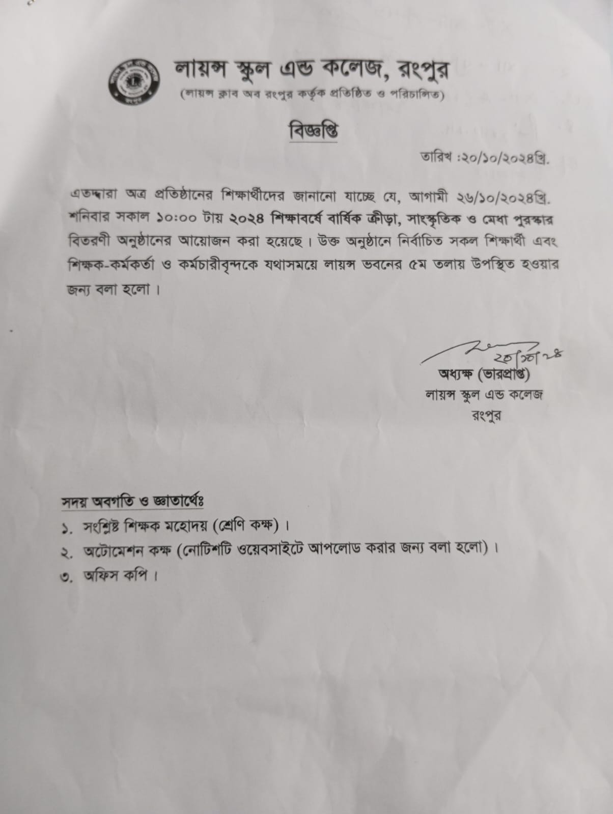২০২৪ শিক্ষাবর্ষে বার্ষিক ক্রীড়া,সাংস্কৃতিক ও মেধা পুরস্কার সংক্রান্ত নোটিশ