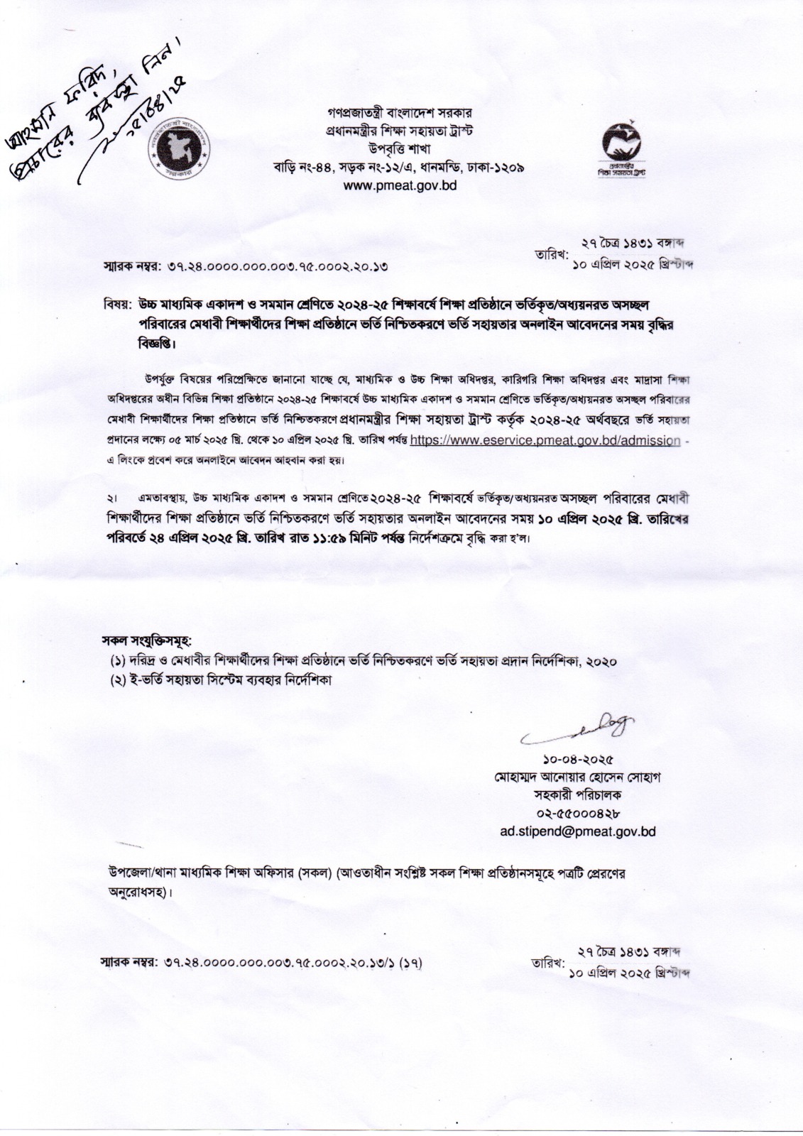 ২০২৪-২৫ শিক্ষাবর্ষে শিক্ষা প্রতিষ্ঠানে ভর্তিকৃত/অধ্যায়নরত অসচ্ছল পরিবারের মেধাবী শিক্ষার্থীদের শিক্ষা প্রতিষ্ঠানে ভর্তি নিশ্চিন্তকরণে অনলাইন আবেদনের সময় বৃদ্ধির নোটিস।