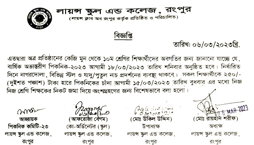 স্কুল শাখার কেজি মুন থেকে ১০ম শ্রেনীর বার্ষিক আভ্যন্তরীণ পিকনিক ২০২৩ সংক্রান্ত নোটিশ