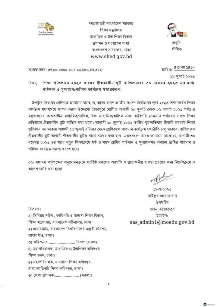 সরকার কর্তৃক গৃহীত আদেশ অনুযায়ী গ্রীষ্মকালীন ছুটি বাতিল হবার কারনে আগামী রবিবার (২৩ জুলাই ২০২৩) তারিখ থেকে ক্লাস যথারীতি শুরু হবে। সবাইকে যথাসময়ে ক্লাসে উপস্থিত থাকার জন্য নির্দেশক্রমে বলা হল।