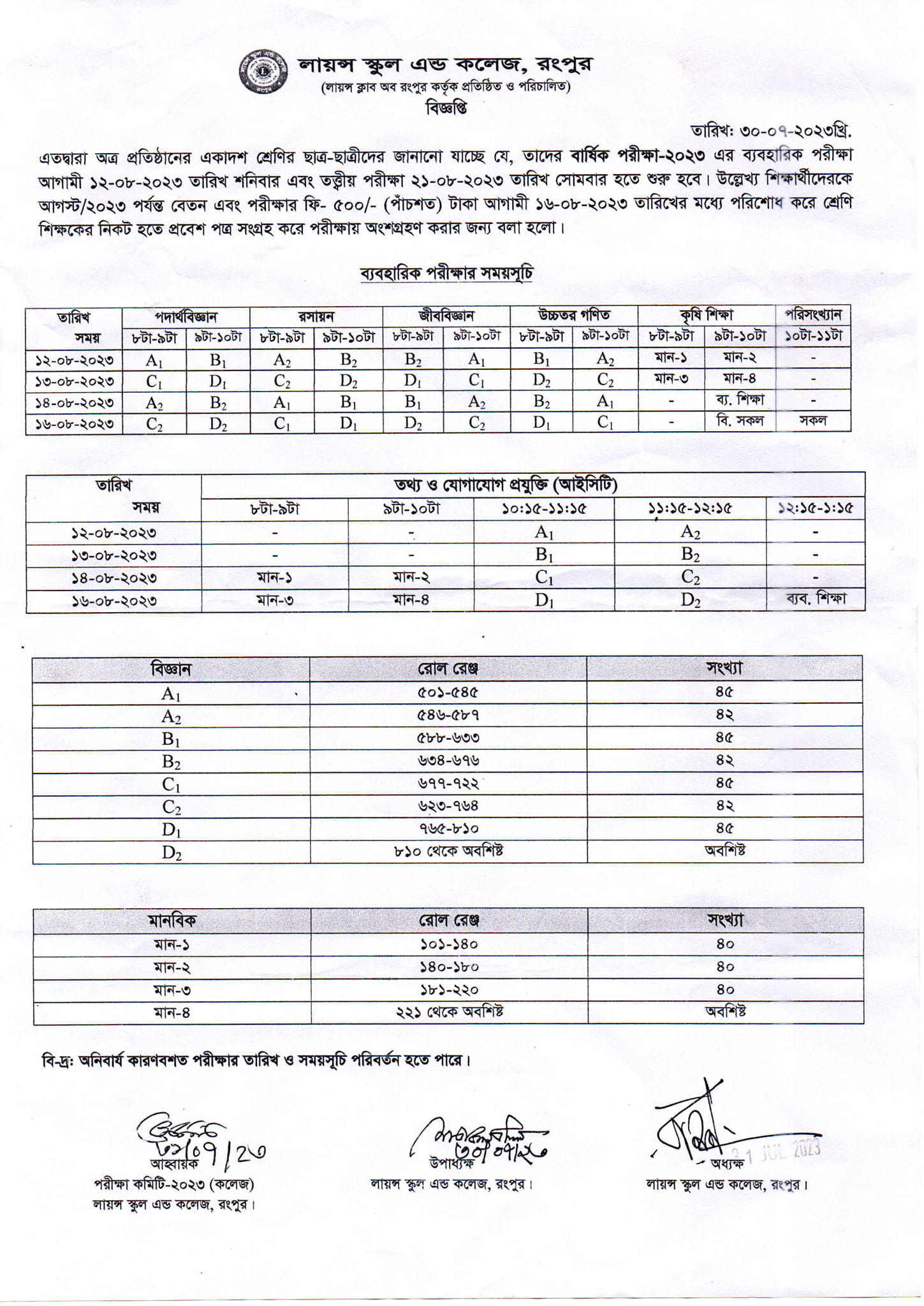 উচ্চ মাধ্যমিক ১ম বর্ষ ব্যবহারিক পরীক্ষার সময়সূচী